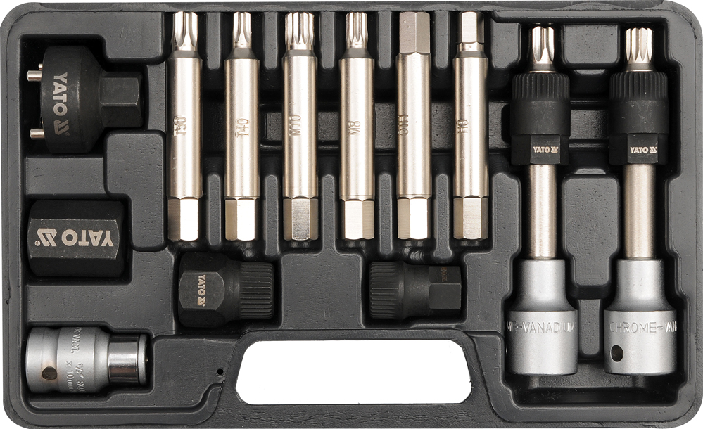 YATO YT-0421 er et professionelt 13-dels topnøglesæt, designet til effektiv montering og afmontering af generatorer af typen Bosch og Magneti Marelli. Sættet gør det muligt at løsne remskivens monteringsskrue, mens koblingshjulet holdes fast med en specialtop. Værktøjet er fremstillet af højkvalitetsstål for at sikre maksimal holdbarhed og præcision, og det er kompatibelt med en lang række bilmærker, herunder Audi, BMW, Fiat, Ford, Mercedes og VW. Sættet leveres i en praktisk transportkasse. Perfekt til både det professionelle værksted og den seriøse gør-det-selv-mekaniker.