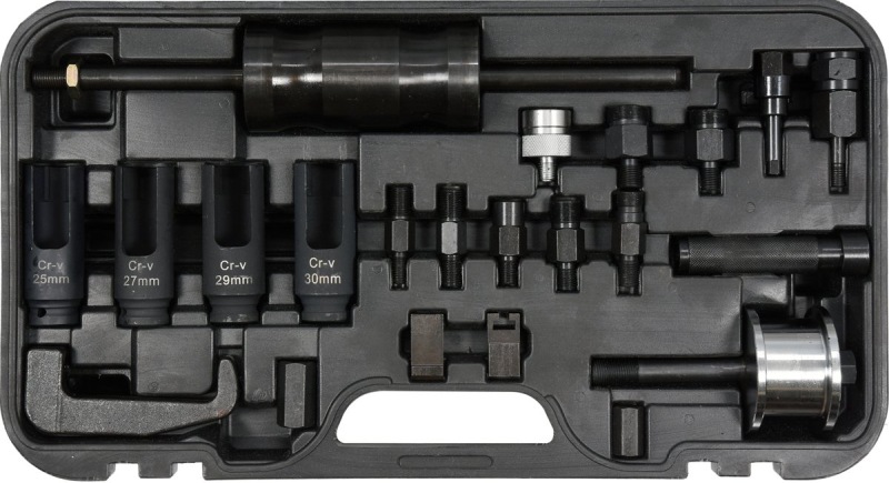 Professionelt 22-delt aftrækkersæt til hurtig og sikker afmontering af fastsiddende injektorer i dieselmotorer, selv på svært tilgængelige steder.