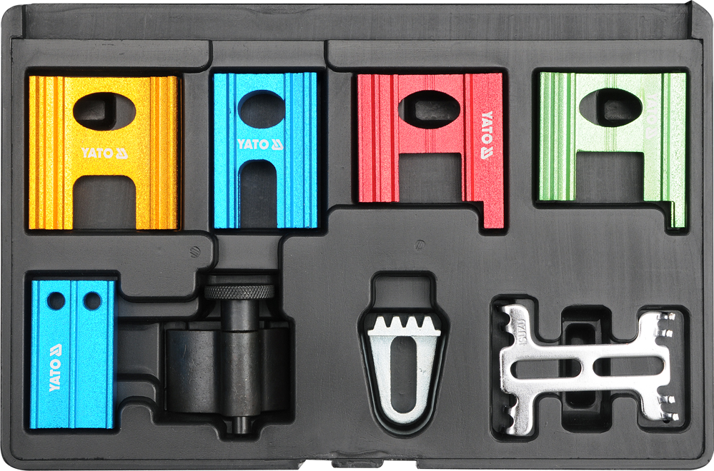 Professionelt 8-dels timing låsesæt fra YATO (YT-0633) til præcis låsning af knast- og krumtapaksel under motorservice.