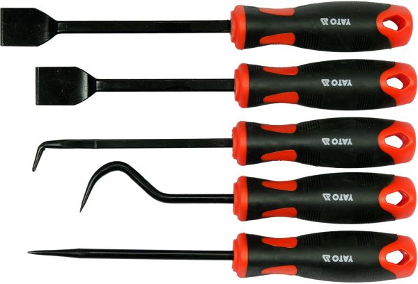 Professionelt 5-delt krog- og skrabersæt fra YATO, designet til præcisionsopgaver inden for bilindustrien, mekanik og byggeri.
