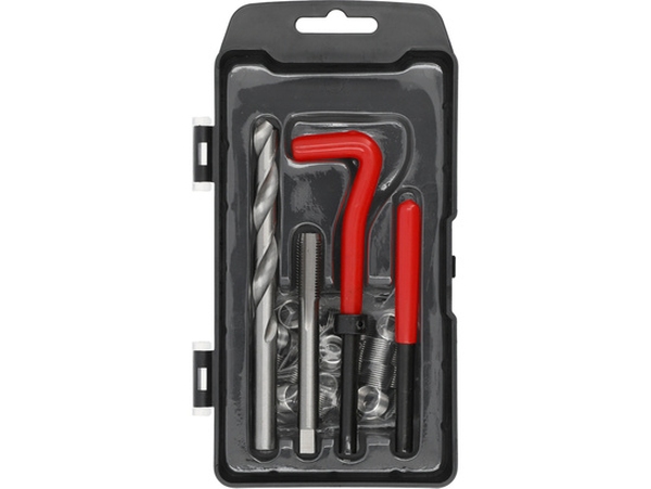 - Komplet sæt med alt nødvendigt værktøj, typisk bestående af bor, gevindtap, monteringsværktøj og slidstærke spiralindsatser.
