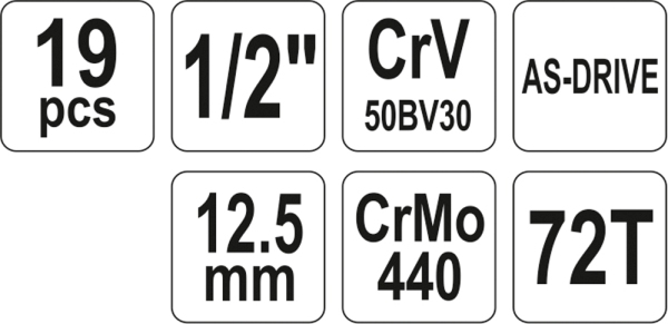 - Komplet sæt med 18 toppe (8-32 mm) og en 1/2" skralde med 72 tænder.