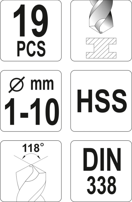 - Sæt med 19 bor i størrelser fra 1,0 til 10,0 mm i 0,5 mm intervaller.